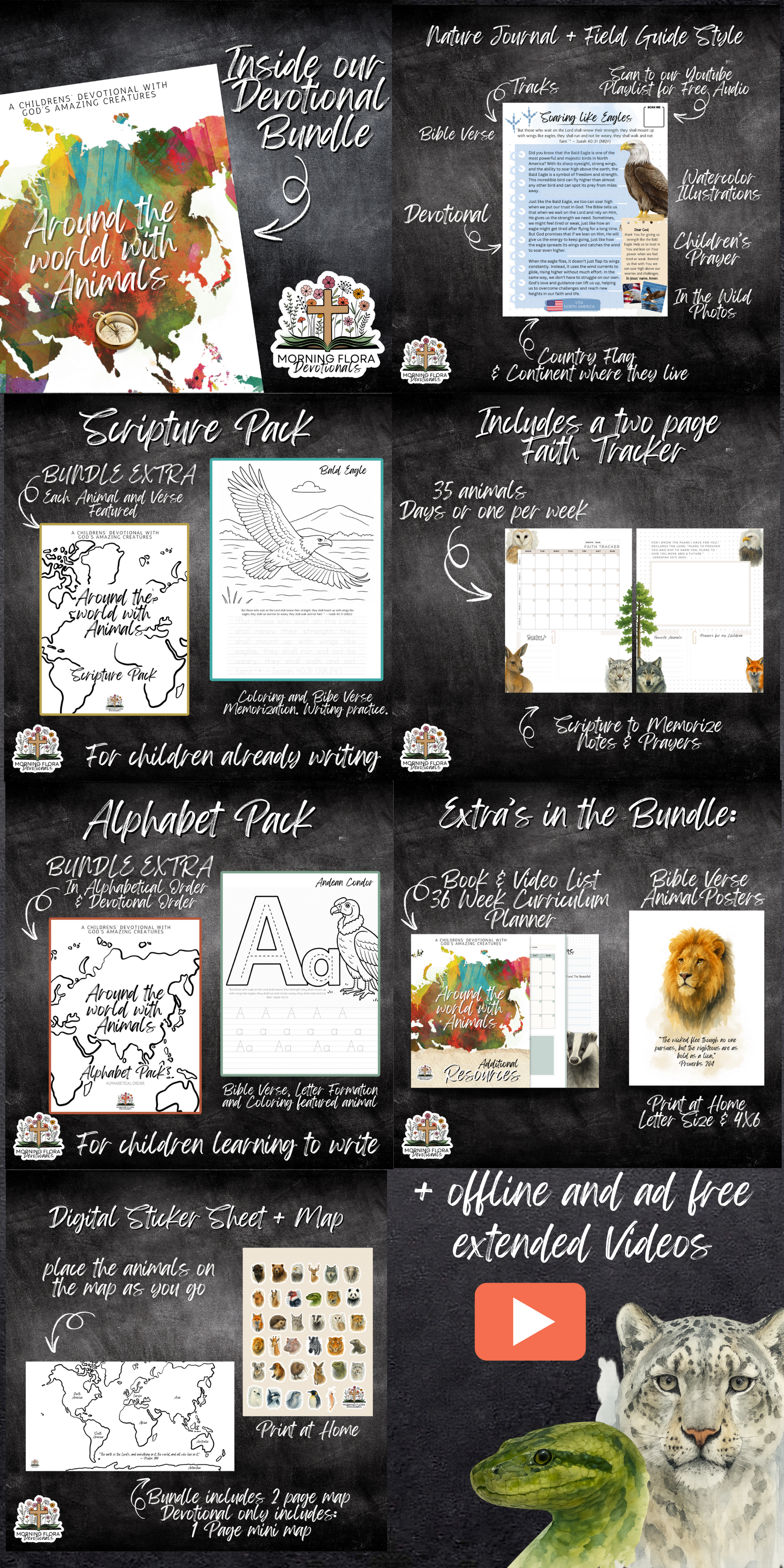 - Audio/Visual Access – Every devotional includes a QR code and clickable link to our YouTube channel to listen to an audio version of the devotional. Purchase the upgraded extended videos to watch the animals which brings the devotional to life! See example here. Choose to read together or watch the animals while listening to the devotional being read aloud. Purchase the bundle if you prefer offline ad free videos to watch vs. the free audio only versions on Youtube.