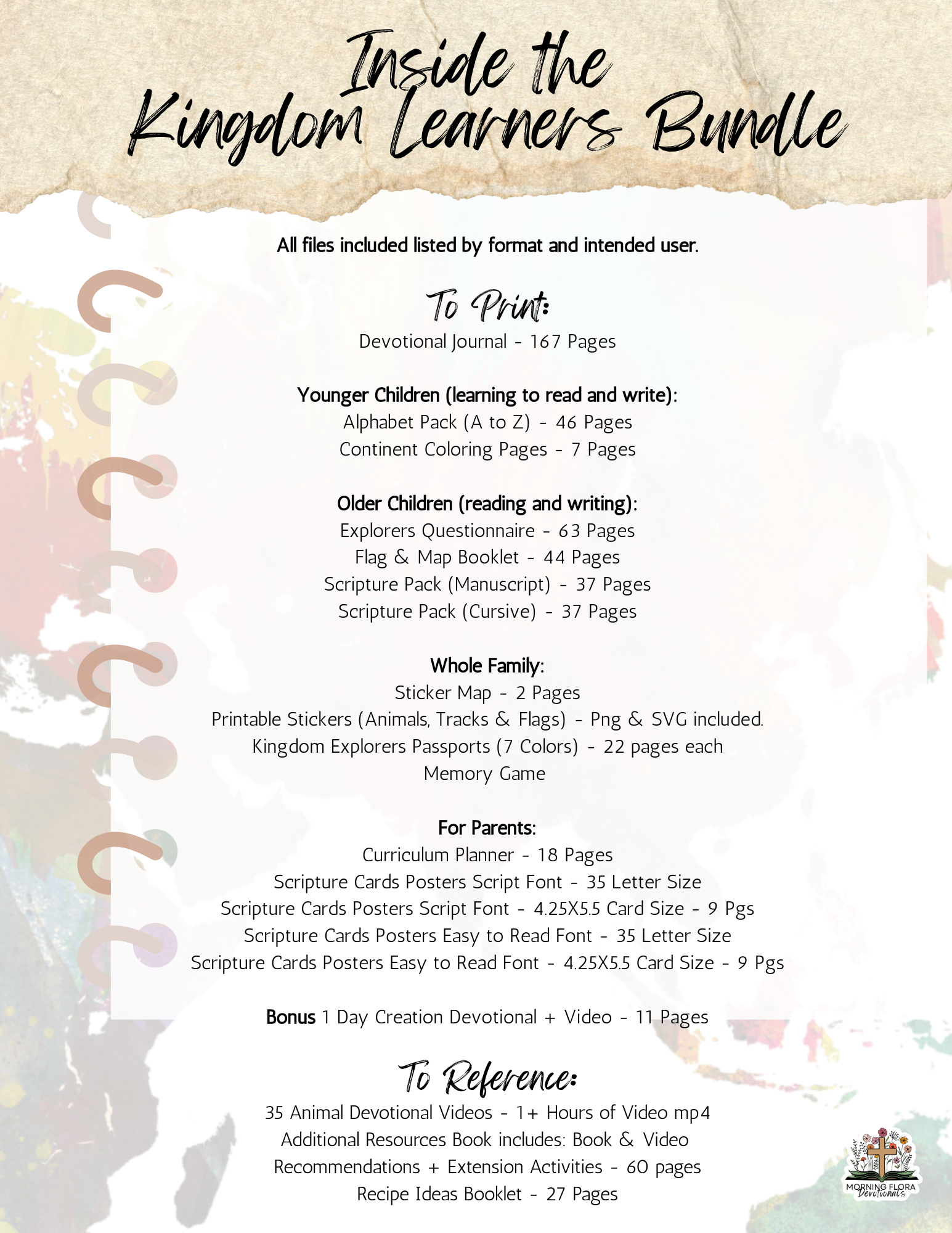 - Family Participation – Begin by saying the Bible verse together, enjoy the devotional through audio or video or readaloud yourself, and invite one of your children to close with prayer. Explore the additional educational resources as part of the Kingdom Learners Bundle to expand your understanding and scripture memorization.